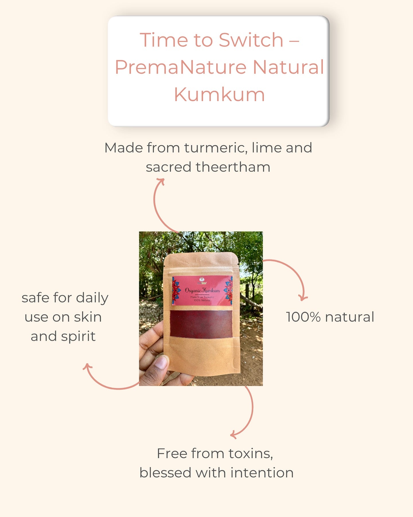 Unlike many market kumkums that contain chemical colorants, PremaNature kumkum is handmade from turmeric and natural herbs, giving it a rich, vibrant red while staying completely pure.